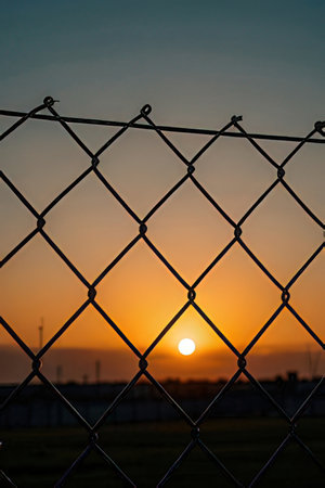 Close up view of chain link fence with sunlight shining through, creating warm and inviting atmosphere. intricate details of metal links are highlighted against soft glow of sunset