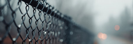 A close-up view of a chain-link fence with raindrops clinging to its surface while soft light illuminates the background in a hazy atmosphere.