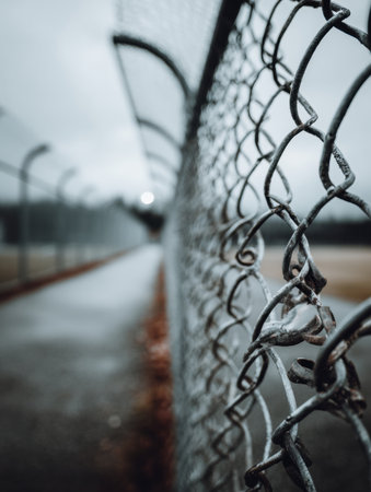 Desolate pathway bordered by a rusted chain link fence under a gray sky, conveying a sense of isolation and stillness in the environment.
