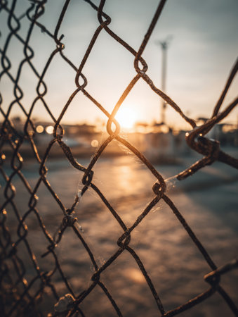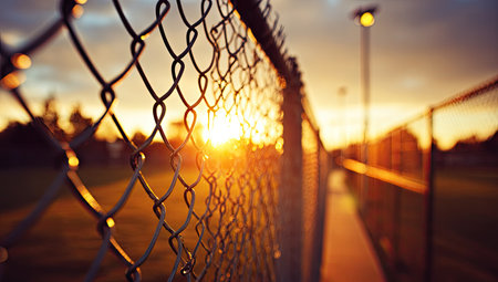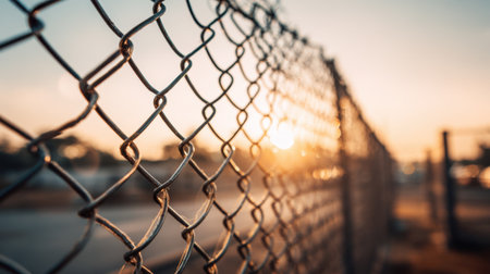 A chain link fence stands tall as the sun rises illuminating the surrounding area with soft light.