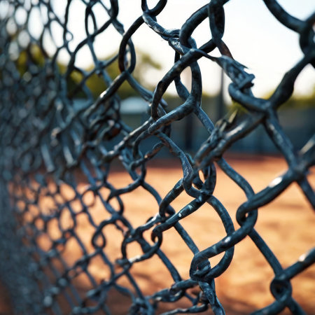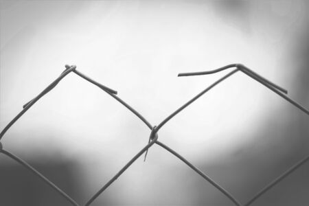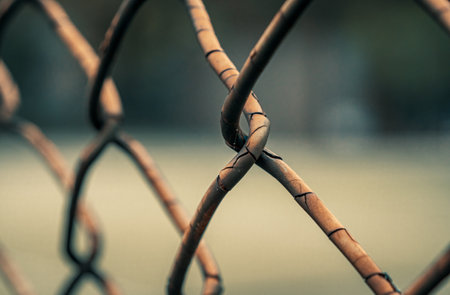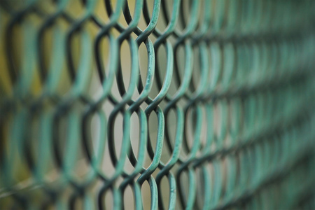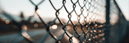 Close-up shot of metal chain-link fence lines with blurred edges, representing strength and separation in urban setting