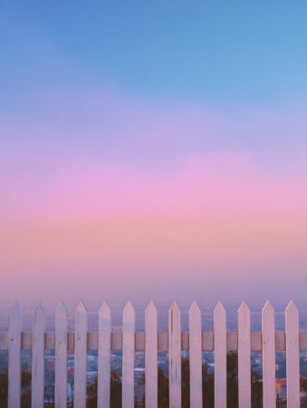 A serene landscape showcases a white picket fence against a vibrant sunset sky filled with shades of pink and blue, creating a peaceful atmosphere.
