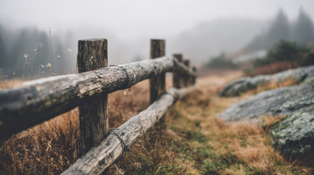 This captivating image captures a foggy landscape featuring a wooden fence and gate, set against a muted gray sky, creating a tranquil and mysterious atmosphere.