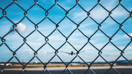 This image captures an airplane approaching for landing, as seen through a chain link fence. The backdrop features a bright blue sky with scattered clouds, creating a dynamic scene that reflects the excitement of air travel.