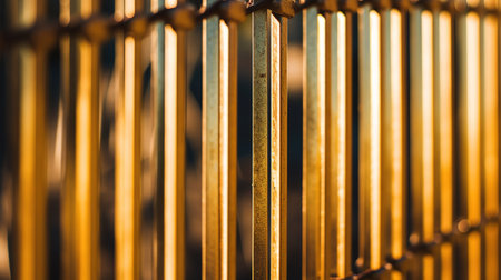 close up of golden metal fence, shallow depth of field, vintage filter
