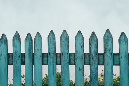 A beautiful blue wooden fence stands tall framing a lush garden below it. The atmosphere is calm and serene as clouds hover overhead.