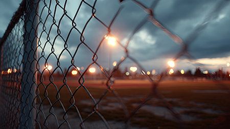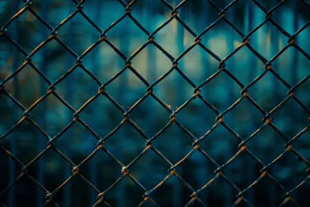 A close up of a chain link fence with some blurry lights in the background, AI