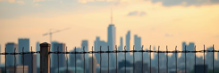 Sunset view of a city skyline with a wire fence in the foreground highlighting urban landscape details