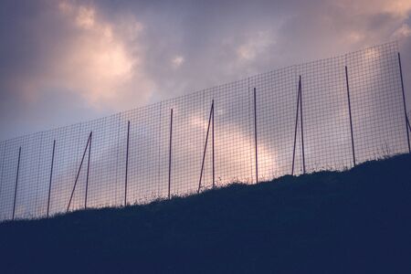 High metal wire net fence on hill against dark cloudy sunset sky