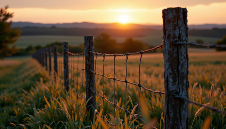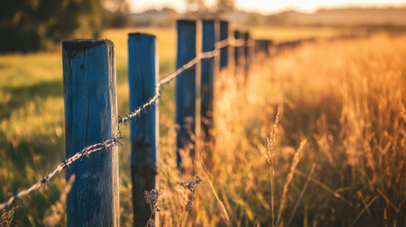 A serene rural landscape showcasing rustic wooden fence posts adorned with barbed wire, bathed in warm sunlight, creating a tranquil atmosphere in golden grass.
