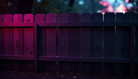 Wooden fence with vibrant colors at night in a yard