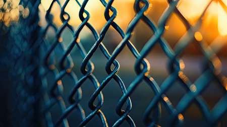 Close-up of a chain link fence with a warm sunset in the background, creating a soft, blurred bokeh effect.