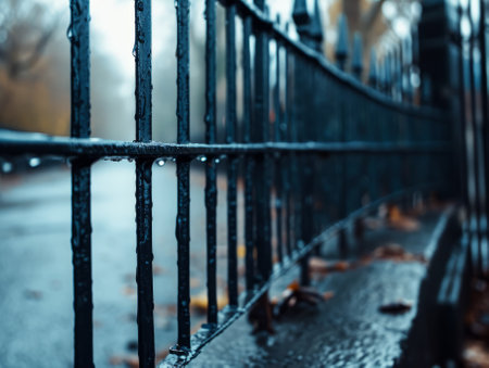 An AI generated illustration of a metal fence covered in droplets of water, illuminated by the sunset