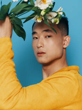 A man of Asian appearance with a bouquet of flowers over his head On a blue background