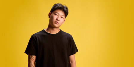 Portrait of young man in black t-shirt standing with relaxed pose and neutral face against yellow background. Concept of human emotions, confidence, fashion, youth, lifestyle, identity, self.