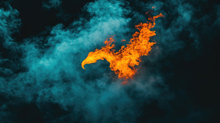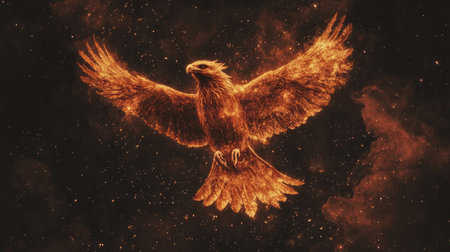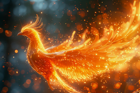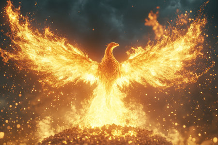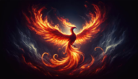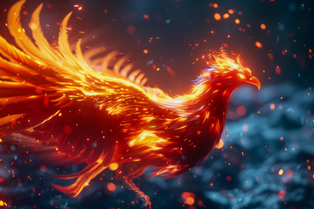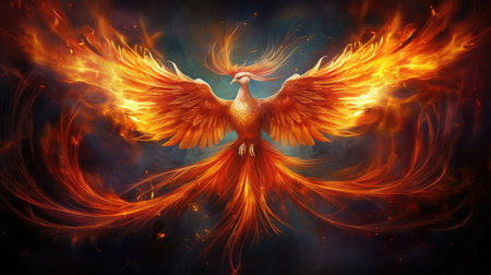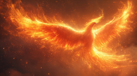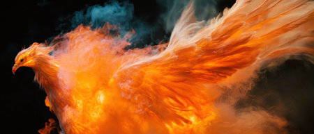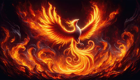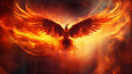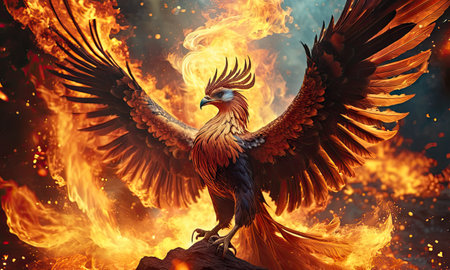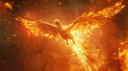 Fiery phoenix rising from flames symbolizing mythical rebirth against a dark background