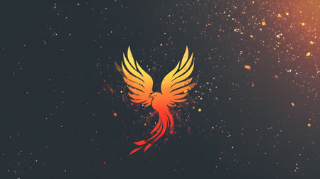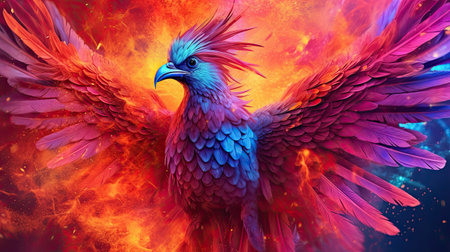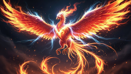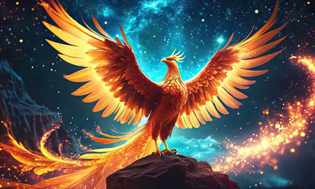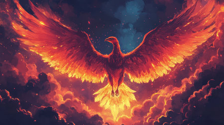 A phoenix rising with flaming wings, depicted in a vibrant illustration against a dark sky.