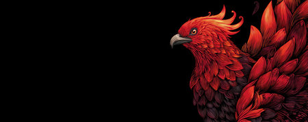 An illustrated bird with vibrant red and orange feathers is depicted against a stark black background. The artwork features detailed textures and a dramatic composition, suggesting a powerful presence. Ideal for editorial layouts, fantasy themes, or designs requiring a striking visual element. Suitable for commercial or artistic applications.