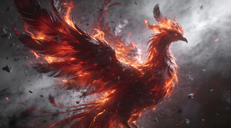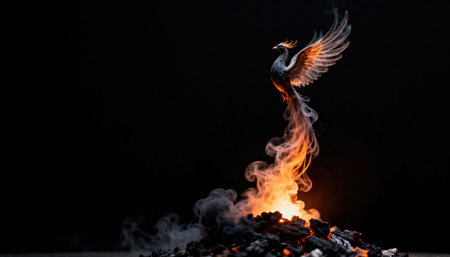 Majestic phoenix rising from smoke and ashes in a fiery rebirth