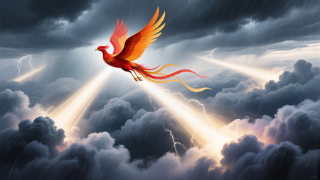 A vibrant phoenix flies triumphantly above dark storm clouds, radiating light.