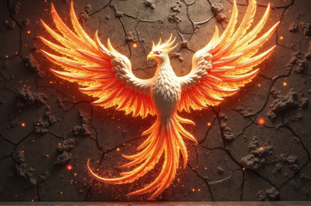 Majestic fiery phoenix soaring against cracked stone wall. That the image is generated using AI.