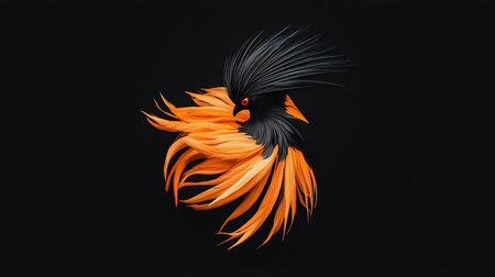 A stylized bird with vibrant orange feathers and a sleek black crest, featuring piercing red eyes, set against a dark background.