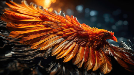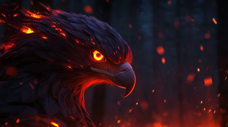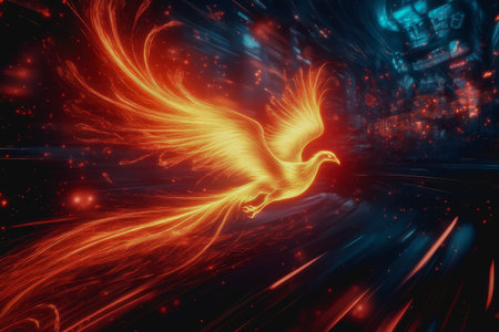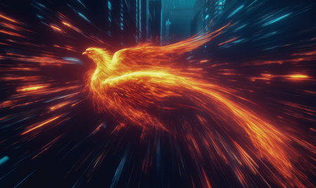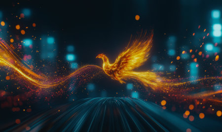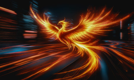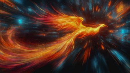 A fiery phoenix in a dark background with dynamic lighting effects