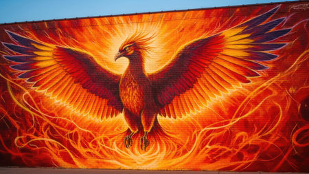 A vibrant mural depicts a phoenix with outstretched wings, showcasing fiery red and orange hues. The artwork features bold lines and a dynamic composition, set against an abstract backdrop. The image likely symbolizes renewal and transformation, with potential applications for decorative or illustrative purposes.