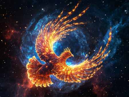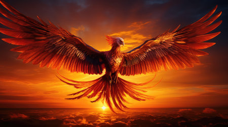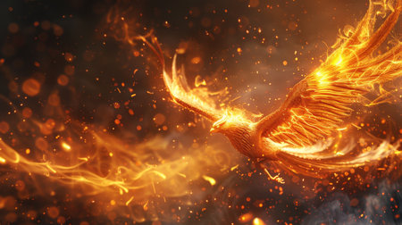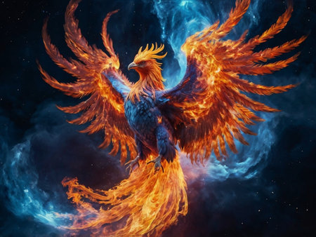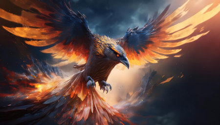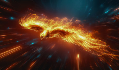 Artistic rendering of a phoenix in flight, its wings ablaze with fire, embodying rebirth and the cycle of renewal.