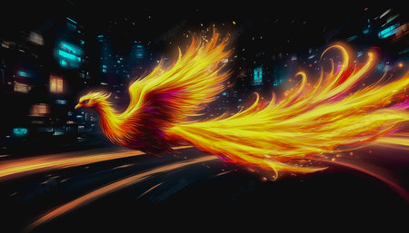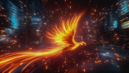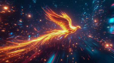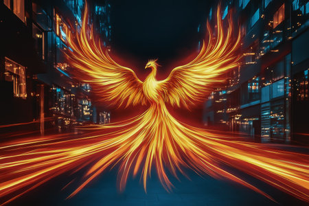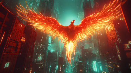 Phoenix bird with bright feather-like flames, rising above a futuristic cityscape, generative ai