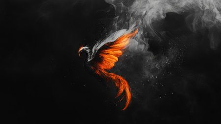 Phoenix rises from glowing embers as flames and smoke curl into a mythical silhouette against deep black negative space, with ample area available for text or design elements, strong warm contrast and sense of motion