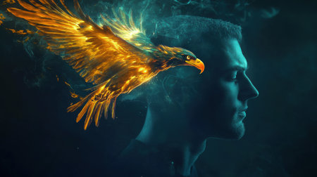 A man's profile stands strong against a backdrop of swirling colors, with a fiery eagle emerging from his thoughts, symbolizing power and freedom in a mystical atmosphere.