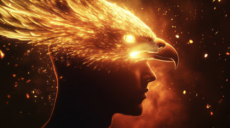 This creative visualization captures a man's profile fused with an eagle head made of flames, symbolizing strength and power against a dark, glowing backdrop.