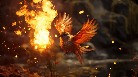 Phoenix, engulfed in flames, rises from a bed of ashes, symbolizing rebirth, renewal, and immortality
