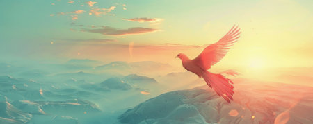 Phoenix bird background featuring a serene, dawn landscape, with the bird's glowing feathers reflecting the soft morning light. The backdrop includes rolling hills and a pastel sky