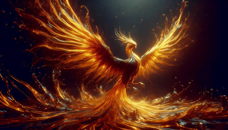 A captivating spectacle unfolds as a vibrant phoenix rises from the water, engulfed in flames.