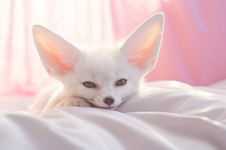a small white fox Fennec laying on top of a bed, a pastel, fantasy smooth pink soft portrait, intense sunlight