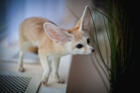 Cute desert fox Fennec. Small, smaller than cat, Fox with huge ears and long fluffy tail. On brief pointed muzzle big black eyes, black nose, big ears. Popular animal in Central Sahara