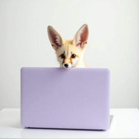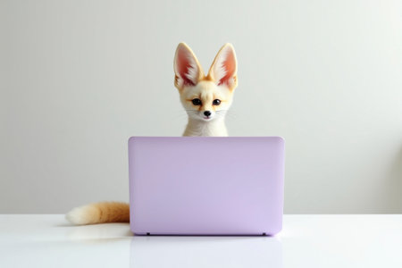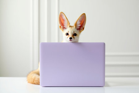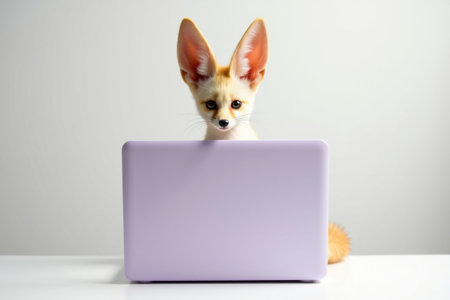 A fennec fox with large ears sits behind a lavender laptop. The minimalist scene is humorous, combining nature with modern technology in a playful depiction.