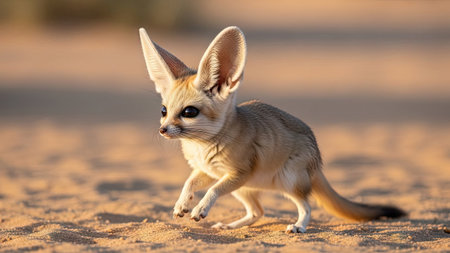 Fennec fox kit in Sahara desert sand dune. Wildlife photography for nature documentaries