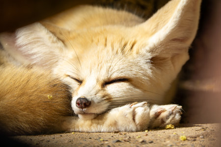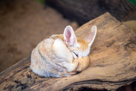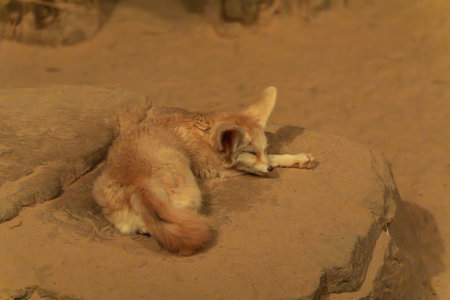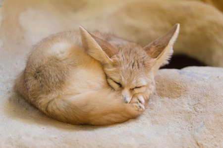 Sleeping Fennec Fox. A fennec fox is peacefully sleeping on a warm rock in a desert-like enclosure. Its large ears and fluffy tail stand out in the sandy surroundings.