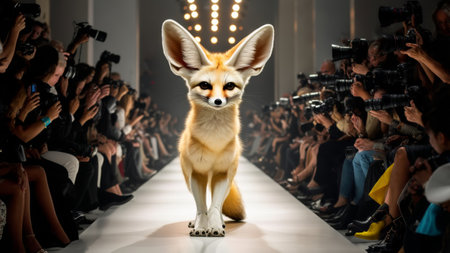Fennec fox strutting confidently down the fashion runway, captivating photographers and spectators while stealing the spotlight with charm