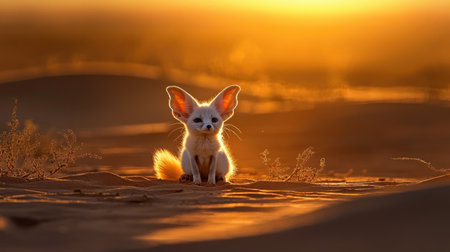 A fennec fox sits gracefully in a vast desert landscape during sunset, its large ears illuminated by the warm orange sunlight. The serene atmosphere captivates with its beauty.