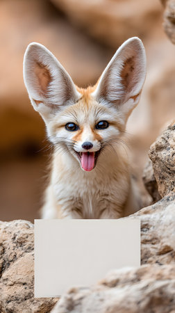 Fennec fox standing among desert rocks while holding a blank sign, looking curious and playful.