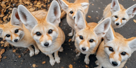 A charming gathering of six fennec foxes showcases their large ears and expressive faces in a delightful outdoor scene.