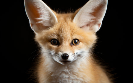 Fennec Fox close-up photograph. Zoom in on the intricate details of its face, featuring focused eyes. This documentary-style photo captures the essence of the Fennec Fox's, desert-dwelling creature.