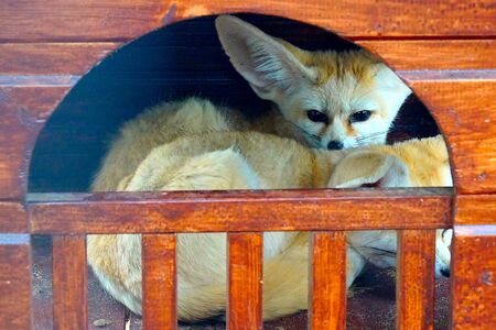 Two small desert fennec foxes with large ears lie in a house in the zoo. Animals.