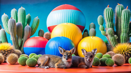 Two playful foxes surrounded by colorful balls and cacti on an orange surface.