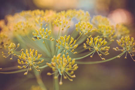 Macro closeup of flowering dill herb cluster flowers growing in garden