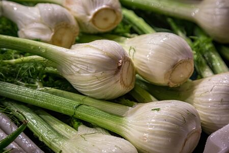 A close up of fennel bulbs on a market stall with a shallow depth of field